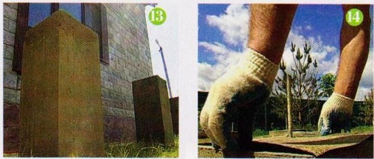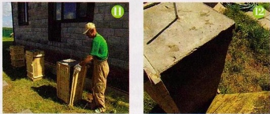 После того как раствор застыл, опалубку убрали (11-13).Готовые столбы накрыли слоем гидроизоляции - рубероидом (14).