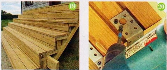 У входа в дом создали деревянный каркас для будущей лестницы (19). Все деревянные элементы конструкции покрыли бесцветной грунтовкой на основе органического растворителя и алкидной смолы. Она защищает древесину, находящуюся на открытом воздухе, от неблагоприятных атмосферных воздействии. Биоциды в составе грунтовки предохранят дерево от грибков, гниения и насекомых-вредителей. Состав также можно применять в помещениях с высокой влажностью. Одного литра защитной грунтовки достаточно для обработки 5-10 квадратных метров деревянной поверхности (в зависимости от породы и качества древесины, чистоты поверхности и метода нанесения). Сохнет состав 2-3 часа. На лаги постелили террасную доску из сосны шириной 13 см. Из нее же сделаны и ступени крыльца. В заводских условиях доска прошла сложную обработку водяным паром под высоким давлением без использования химикатов и красителей. Пар позволяет нагреть древесину до 200 градусов по Цельсию - это выше температуры горения. После этого доска становится устойчивой к осадкам, перепадам температур, воздействию паразитов и приобретает стабильную геометрию. Такая доска не гниет и сохраняет свой первоначальный вид долгие годы на открытом воздухе без всякой химической обработки. Если же она выгорит от воздействия ультрафиолета, достаточно будет счистить верхний слой шкуркой или щеткой, и доска вновь приобретет приятный естественный цвет. Общая толщина доски - 4 см - без труда позволяет сделать это. Террасная доска имеет и специальное противоскользящее покрытие. Поверхность профилирована в виде волны - такой рельеф получил название «вельвет». Террасную доску зафиксировали на лагах с помощью металлических уголков (20).