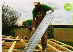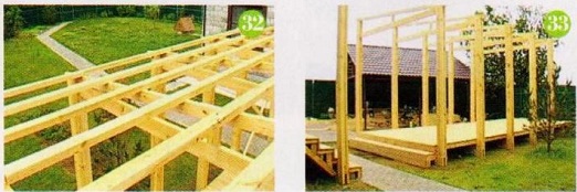 Сначала собрали каркас террасы - опорные столбы с помощью саморезов соединили с кровельными балками. Верхняя часть конструкции выполнена в форме треугольника - крыша будет наклонной (32,33). Это позволит дождевой воде беспрепятственно стекать вниз. Чтобы придать конструкции прочность, наверху установили балки из бруса, закрепив их на опорах. На крыше постелили листы оцинкованного профнастила (34.35). Потолок обшили рейками из сосны (36.37), которые выполняют декоративную функцию. С одной стороны, они закрывают профнастил. а с другой, повторяя обрешетку стен, создают единую стилистику пространства. Рейки покрыли антисептиком на водной основе. Он защитит древесину от вредоносных насекомых, грибков и гниения. Состав используется для пропитки дерева, находящегося на открытом воздухе, а также во влажных помещениях.